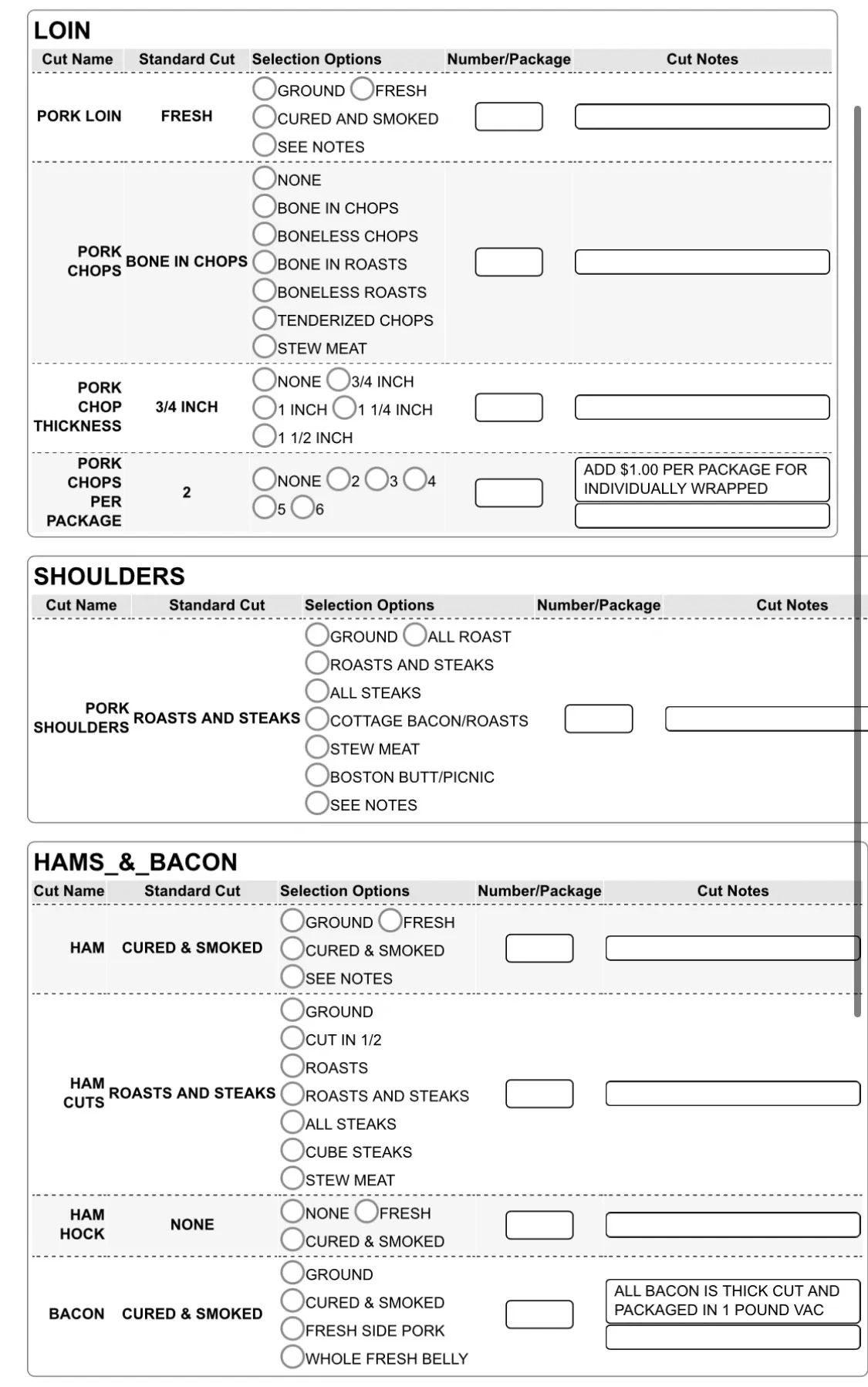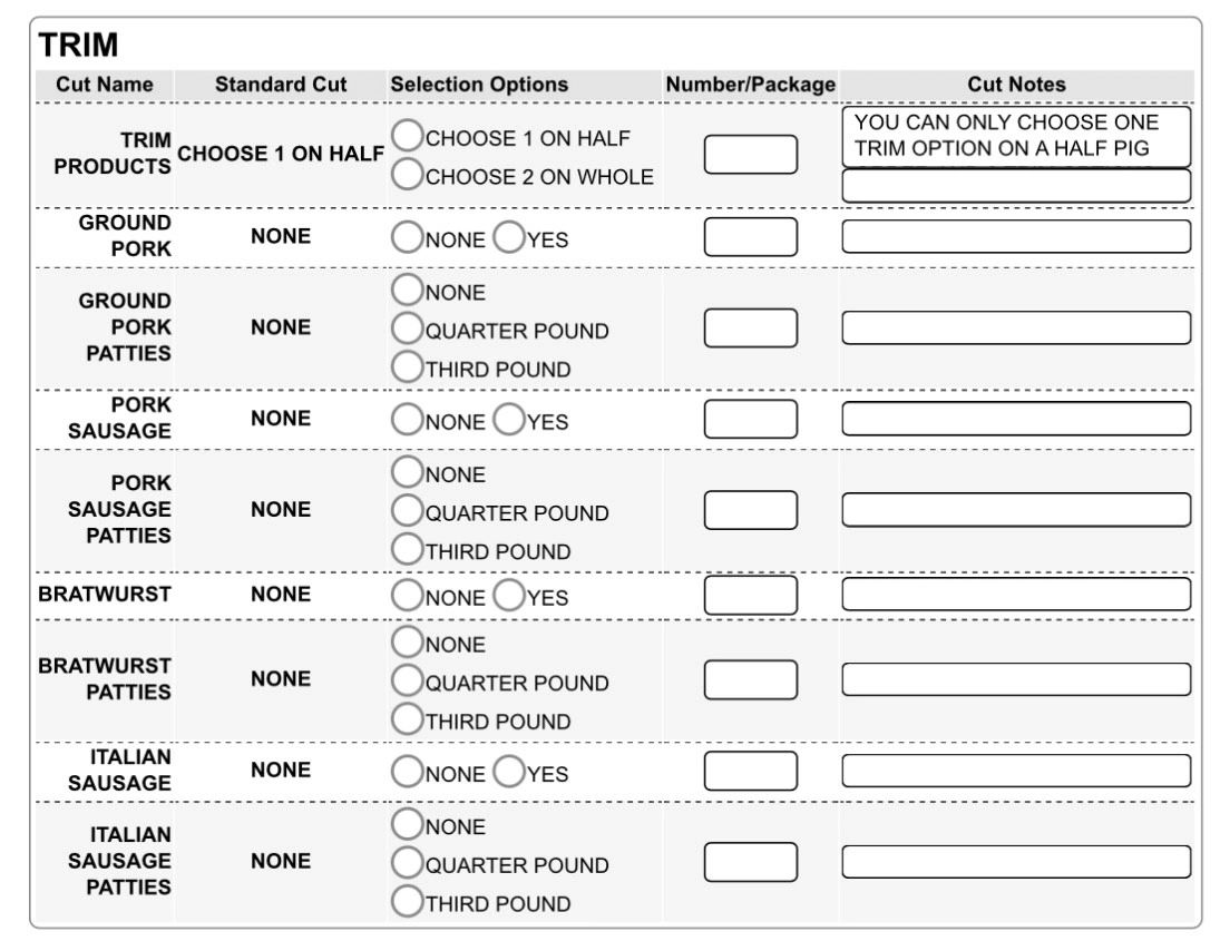 Additional charges apply to extra deboning/grinding, specialty cuts, extra wrapping/packaging and how you choose to process your trim!